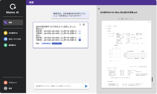 土木技術者の専門情報の検索・参照を支援するAIチャット型のナレッジマネジメントシステムです。お客様の社内データベースに蓄積された過去事例やノウハウなどの情報をデータベースに読み込ませてAIに学習させ、質問内容を入力すると自然言語を用いた対話方式で回答が表示されます。一般的なAIチャットツールと異なり、土木技術者向けに検索アルゴリズムを専門化しており、さらに会社ごとに必要な情報を読み込ませるため用途に応じた高度なチューニングが可能です。AI技術を実務に落とし込んだこのシステムは、ベテランの知見がないと判断しにくい設計検討の場面でも、土木技術者の情報検索速度を圧倒的に向上させ、さらにはチーム全体のノウハウ共有の効率化も実現します。