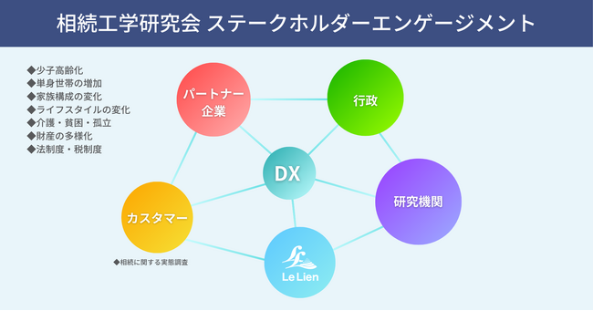 葬儀社、金融機関など、地域において相続に接する機関との連携を強化し、大学や行政と手を取り合いながら相続のメカニズム=「相続工学」の研究を進めることで相続リスクマネジメントの旗手として社会課題の解決に繋げていく取り組みです。