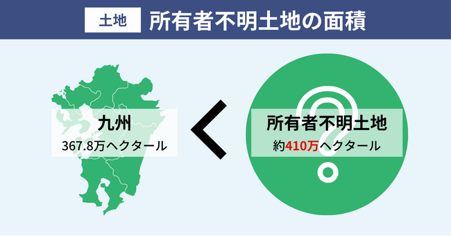 日本国内において、持ち主がすぐにわからない、もしくは連絡がつかない土地、いわゆる「所有者不明土地」の面積は、約410万ヘクタールあるといわれています。これは九州の面積(367.8万ヘクタール)を超える面積となっています。