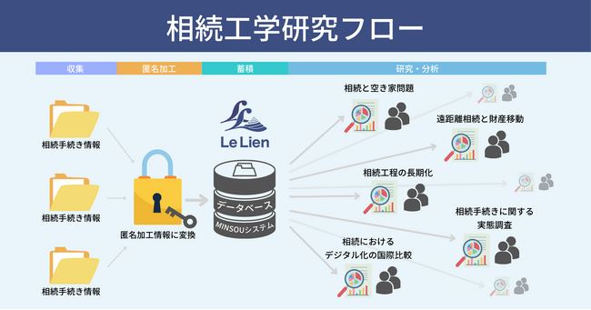 これまでの相続手続きで蓄積されたデータ(MINSOUシステム ※1)をもとに、空き家や所有者不明土地発生のメカニズムや因果関係の解明、相続財産の距離移動実態把握、自治体毎の相続工程の長期化要因分析、相続のデジタル化推進などをテーマに取り組んでいます。これにより、土地や建物の有効活用方法の提言(市場流通への適切なアプローチ方法や、地方創生や未来社会への提言など)に寄与し、デジタルトランスフォーメーション時代ならではの相続のあり方の構築を目指しています。
