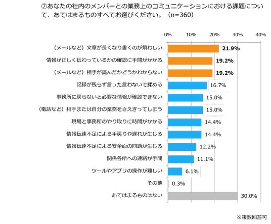 回答のトップ3は、「文章が長くなり書くのが煩わしい」(21.9%)、「情報が正しく伝わっているかの確認に手間がかかる」(19.2%)、「相手が読んだかどうかわからない」(19.2%)でした。