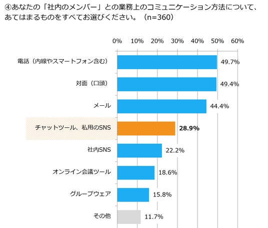 最多回答は「対面」(30.7%)で、「電話」(16.9%)、「チャットツール、私用のSNS」(15.4%)、「メール」(14.7%)の順となりました。