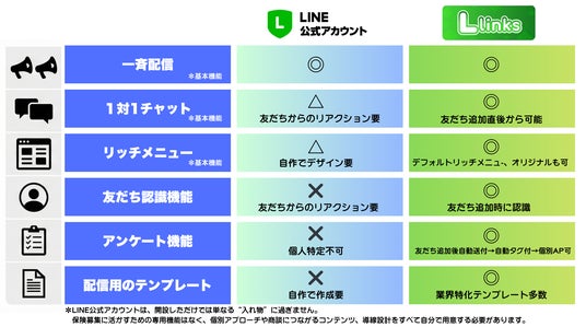 「Llinks」は、保険募集人がLINEを通じて見込み客・既契約者との関係強化、配信・自動化、ニーズ把握といった営業活動を支援するLINE公式アカウント連携ツールです。