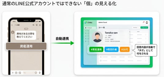 回答された選択肢に基づき、ユーザーごとにニーズをタグとしてLlinks管理画面に付与。