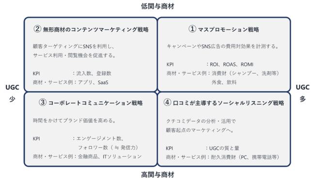 トリプルメディア(※)の中でアーンドメディアと位置づけられることが多いSNSですが、ソーシャルメディア委員会としては企業が運営するSNSではオウンドメディアやペイドメディアとしての側面もあると考えています。オウンドメディアやペイドメディアとしての要素が強い企業SNSの運営においては、「商材の特性」と「UGC(User Generated Contents、SNS上のクチコミなどを指す)の量」がSNS運営の戦略を分けると考えられます。「企業SNSのためのKPI設定フレームワーク Ver.1.0」では、以下の画像のように、4つの類型を提示しています。