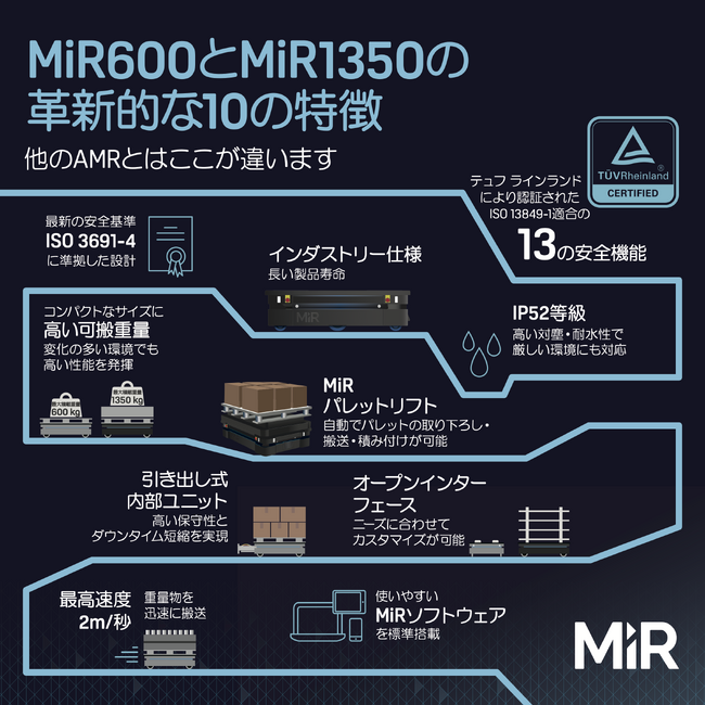 テュフ ラインランドがMiRの重量物用自律型モバイルロボット(AMR)「MiR600」と「MiR1350」の13の安全機能を認証ー安全性に対する信頼構築と成長市場で顧客の期待に応えるための重要な一歩