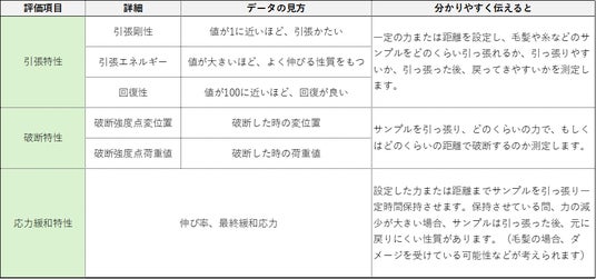 3.“毛髪のスタイリングのしやすさに関係する” ※2とされている「応力緩和※3」や「引張特性」の測定が100回連続で行うことが可能に。ゴムや糸など伸長するサンプルを連続測定することで、最初の数値から最終どのくらいの数値になり変化(伸び率や回復性など)が起こったのかを評価できます。