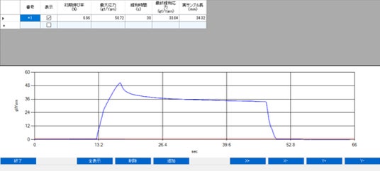 例:応力緩和特性。50gで力を設定し30秒間保持した場合、16.88gの力が減少していることが分かります。