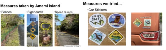 アマミノクロウサギのロードキル(交通事故死)について、アマミノクロウサギを守るために、これまで実施したステッカー作成やラジオでの啓蒙、そして5年以内に行う解決策を提案。