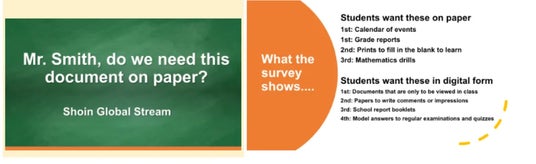 紙の過剰使用について、生徒の目線から先生に向けて問題提起・調査したプレゼンテーション。校内での調査を踏まえて、紙媒体で提供してほしい資料とデジタルで提供してほしい資料を提案。