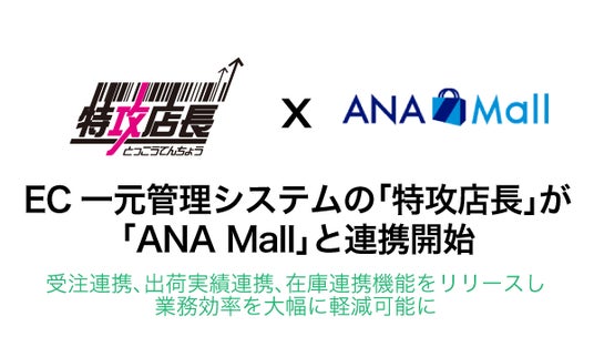 株式会社キャプサー(本社:兵庫県神戸市 / 代表取締役 縄舟優一)が提供するEC一元管理システム「特攻店長」は、ANA X株式会社(本社:東京都中央区 / 代表取締役 神田真也)が運営する「ANA Mall(エイエヌエーモール)」と受注連携、出荷実績連携、在庫連携ができる機能の提供を開始しました。