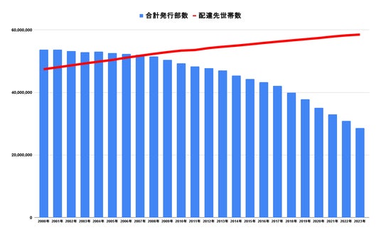 出典:日本新聞協会 タイトル:新聞の発行部数と世帯数の推移)新聞の発行部数と世帯数の推移発行部数が減少傾向にある一方で、2000年以降の配達先世帯数は約4,742万世帯から約5,849万世帯と約23%増加しました。