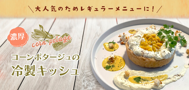 ひんやりとしたキッシュを楽しんで頂こうと、定番商品で不動の人気の「フンワリ軽いクリームチーズケーキ風キッシュ」と期間限定商品「富良野メロンの夏塩レアチーズキッシュ」に加え、新たに登場したのが「焼きとうもろこしの濃厚コーンポタージュの冷製キッシュ」