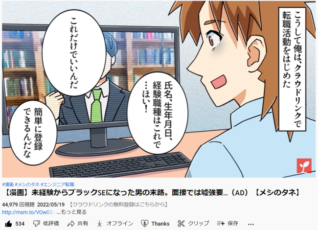 ブラック会社に勤めるSEが苦節を経て、クラウドリンクを利用し見事転職に成功するというストーリーを漫画動画として作成・公開頂きました。