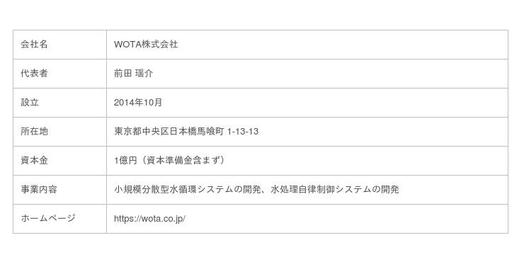 株式会社MOL PLUS(代表:阪本拓也、本社:東京都港区、以下「MOL PLUS」)は、「小規模分散型水循環システム」および「水処理自律制御技術」を開発・提供するWOTA株式会社(代表取締役:前田瑶介、本社:東京都中央区、以下「WOTA」、読み:ウォータ)への出資を決定しました。