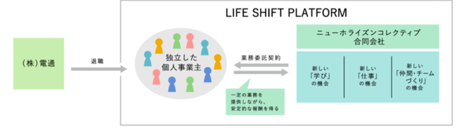 ・事業概要:株式会社電通が100%出資し、「ライフシフトプラットフォーム」を運営しながら、プロフェッショナルパートナーとともに社会に対して新たな価値提供をする会社。