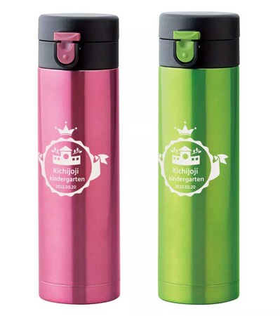卒園記念品・卒業記念品に人気のステンレスボトルに園名と卒園日をデザインしました。文字を飾る王冠や園舎のイメージは、テンプレート(T29003)を使用しています。