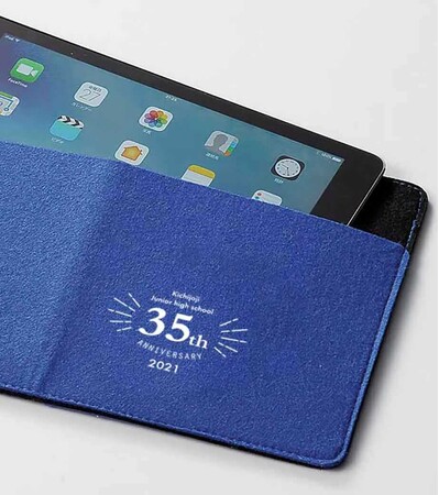 いまや学校運営に欠かせないタブレットケースに子供たちが喜ぶ元気いっぱいのテンプレート(T35007)を配置しました。シンプルながらも記念品らしいデザインです。