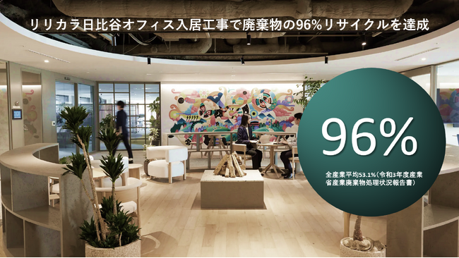 これまでのスペースソリューション事業部のオフィス構築では、発生する廃棄物の約20%がリサイクルされずに廃棄されていました。2023年の新オフィスの入居工事においては、オフィス構築において発生する廃棄物を限りなくゼロにすることを追求する「廃棄ゼロ」にチャレンジいたしました。設計・工事計画・現場それぞれの段階で廃棄物の削減に取り組み、その結果、全産業の産業廃棄物の平均リサイクル率を大幅に上まわるリサイクル率96%を達成しましたのでご報告いたします。