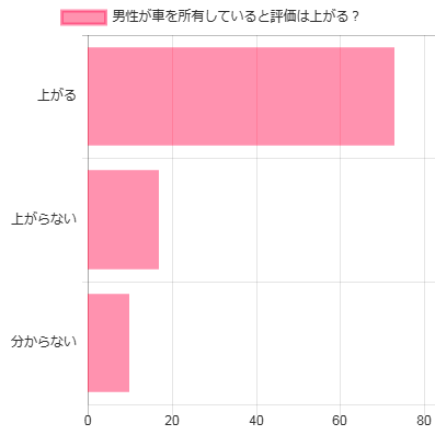 こちらも「上がる」が73%、「上がらない」は17%、分からないが10%となり、男性が車を所有することが女性の評価を高めることが分かりました。