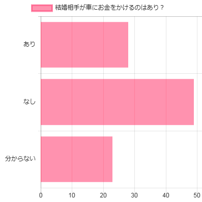 結婚相手が車にお金をかけることについて質問したところ、「あり」は28%、「なし」は49%となり、なしと考える女性がもっとも多い結果となりました。
