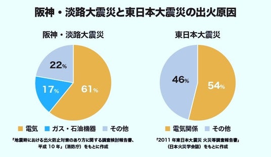 マンションは災害に強く、震災時の倒壊や火災時の延焼リスクは木造の戸建住宅と比較すると低いと言われていますが、一方で将来発生する可能性が高い大地震への対策が遅れていることも指摘されています。阪神・淡路大震災と東日本大震災で発生した火災のうち、電気に関連したものが半数以上を占め、その多くが通電火災※によるものです。