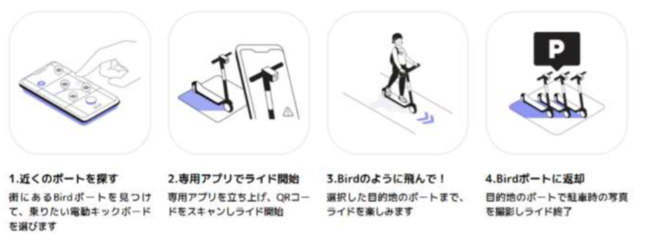 スマートフォンアプリ「BIRD」をダウンロード後、会員登録、免許証登録、交通確認テスト等、アプリ内手順に従い登録完了後、以下手順にて利用基本料金1分10円(※実証実験期間特別料金)
