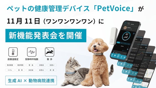 犬猫向けスマート首輪を提供する株式会社PetVoiceは(本社:東京都中央区京橋 代表取締役:深田 篤)は、PetVoice新機能発表会を2024年11月11日(ワンワンワンワン)に開催します。
