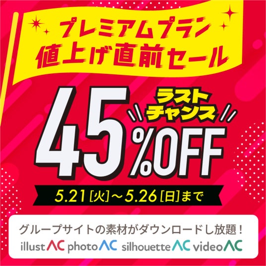 ACワークス株式会社(大阪市西区)が運営する、日本最大級の素材サイト「イラストAC」や「写真AC」を含む多数のサイトが使い放題の「プレミアムプラン」が値上げ直前セールを開催します。