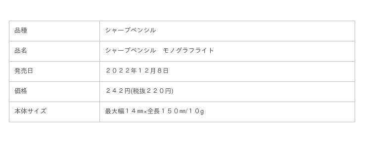 株式会社トンボ鉛筆(本社・東京都北区、代表取締役社長・小川晃弘)は、ペン先まわりが明るく細字もクリアに書けるロングメタルパイプブームを創ったシャープペンシル「モノグラフ」(2014年春発売)のエッセンスをお求めやすい希望小売価格242円(税抜220円)で実現した新製品「モノグラフライト シャープペンシル」を12月8日※から順次発売します。※店頭には順次導入されるため、詳しい発売日は最寄りの文具店様にお問い合わせください。