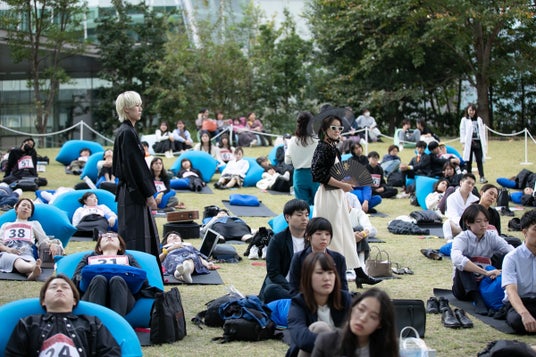 大会は90分いかに心身リラックスさせられるかを競う「ぼーっと」コンテスト。参加者は自身の職業や立場を象徴する格好で出場し、心拍数の変動を測定しリラックス度も判断基準とし、芸術性と技術性の両面から評価されます。