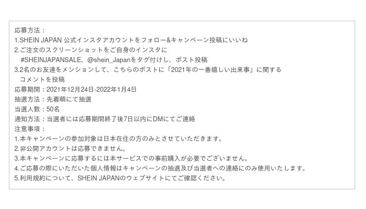 【期間限定】2021年12月24日(金)~2022年1月4日(火) 特設サイトURL:https://jp.shein.com/campaign/sheinjapansale
