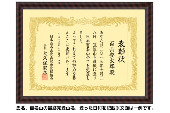 表彰状は、登った方の氏名と、百名山の最終完登山名、そして登った日付を記した、あなただけのものです。