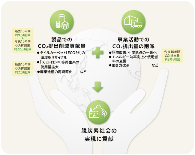住江織物グループは目標達成に向け、事業活動によるCO2排出量の削減に対する具体的な取り組みを積極的に実施するとともに、環境対応型商材の拡販の両軸で、脱炭素社会の実現に貢献してまいります。