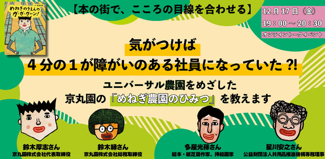 12月3日刊行『めねぎのうえんのガ・ガ・ガーン』(合同出版)は浜松で400年を超える歴史ある「めねぎ農園」の実話を基にした、障がい者とは何かを身近に考える絵本です。今回は「めねぎ農園」代表の鈴木厚志さんと鈴木緑さん、絵本の著者でもある多屋光孫さんと共用品推進機構専務理事の星川安之さんをお招きし、農園のお話しや絵本に出てくるシーンの舞台裏など障がい者雇用に関して、参加者みなさまとの目線合わせの可能性を探ります。