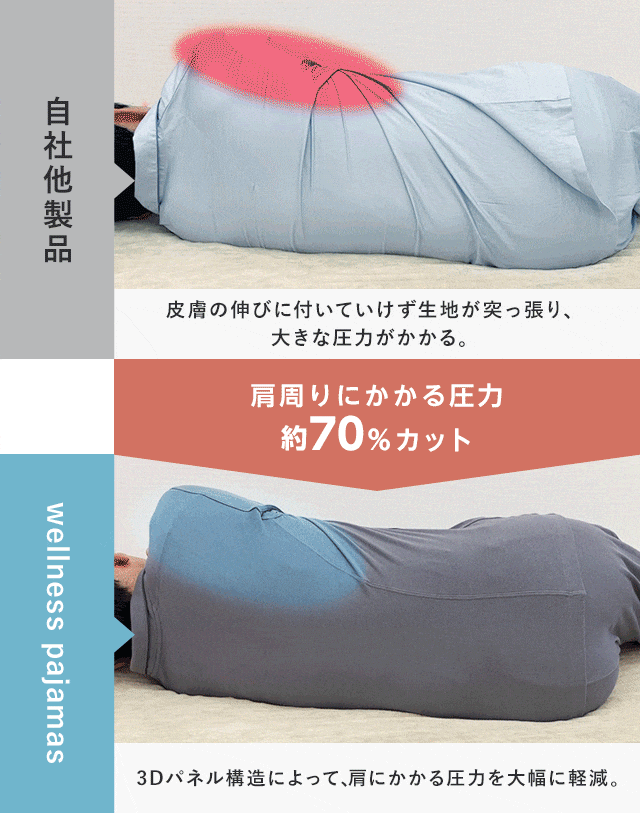 「wellness pajamas」は独自に開発した“3Dパネル構造”によって、寝返り時に肩にかかる圧力を大幅に軽減。それによりスムーズな寝返りを可能にしました。