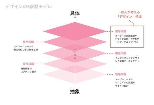 具体的には、デザインには「戦略」「要件」「構造」「骨格」「表層」の5段階があります。非デザイナーの考える「デザイン」はこの『表層段階』ではないでしょうか?