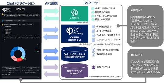 株式会社キャピタル・アセット・プランニング(本社:大阪市北区、代表取締役社長:北山雅一、以下「 当社 」) は、生成AI技術を活用した新NISA向け投資提案アプリ「W2C」のβ版(試用版)の開発を完了し、2024年1月から金融機関向けに提供を開始しますので、お知らせします。