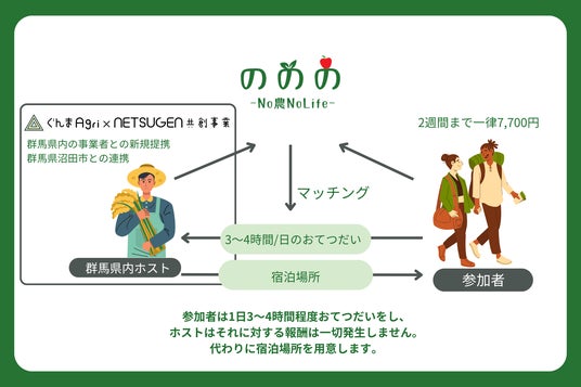 株式会社Perma Future(本社:静岡県沼津市上土町100-1 ナティ沼津801、代表取締役:池田航介、以下「当社」)は、群馬県より「令和7年度『ぐんまAgri×NETSUGEN共創』実証事業」を受託しました。これに伴い、当社は2025年5月中旬より、都市部等の参加者が農業を手伝う「農業ワーケーション」を群馬県内で実施します。当社は2023年7月より、参加者が農家に宿泊し、農作業を手伝いながら旅を楽しむ「ののの」事業を展開してきました。名称には「No 農 No Life」という思いが込められています。