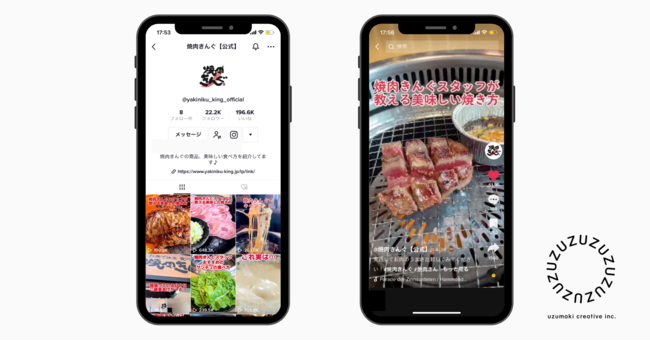 Z世代向けSNSマーケティング事業を展開する、株式会社uzumaki creative(本社:東京都渋谷区、代表取締役:木田陽真、以下:uzumaki creative)は、株式会社物語コーポレーションが運営する焼肉きんぐのTikTokの運用支援をいたしました。