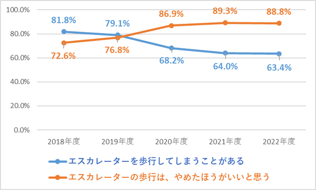日本エレベーター協会では本キャンペーンに合わせて、公式ホームページ上で「エレベーター・エスカレーターの安全な利用に関するアンケート」(注)を毎年実施しています。昨今、埼玉県や名古屋市では安全な利用の観点から、エスカレーターの歩行禁止を規定する条例が制定されています。当協会でエスカレーターの利用に関して調査した結果、2022年度に「エスカレーターの歩行は、やめたほうがいいと思う」と回答した人の割合は、88.8%と高い水準となりました。また、「エスカレーターを歩行してしまうことがある」人の割合は、減少傾向が続き63.4%でした。