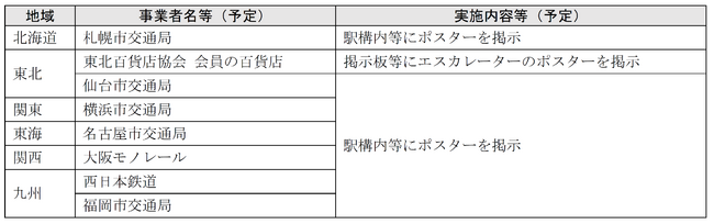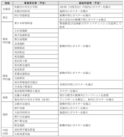 鉄道事業者(28社局)及び協会(4団体)、札幌市(199校)及び桑名市の市立小学校(28校)、札幌市消防局、大阪市消防局、神戸空港等のご協力をいただき、ポスターの掲出等を表3のとおり実施します。なお、実施開始時期及び掲出期間は、各事業者によって異なります。