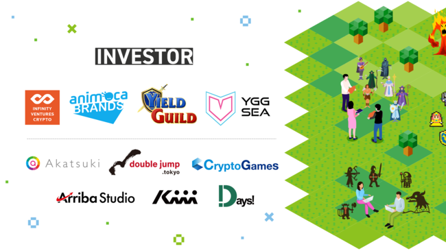 Infinity Ventures Crypto (IVC)、Animoca Brands、YIELD GUILD GAMES、YGG SEA、株式会社アカツキ、double jump.tokyo Inc. 、CryptoGames Inc. 、アリーバ・スタジオ、株式会社 Kiii、株式会社Days、計10社 及び投資家4名(国光宏尚氏、三宅裕之氏、森和孝氏、Mr.Block) (順不同)