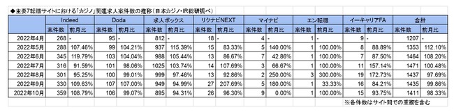 ■2022年10月時点での最新の「カジノ」関連の登録求人案件数と動向