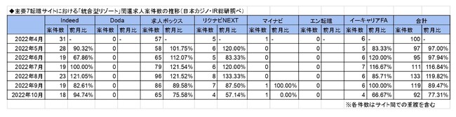 主要転職7サイト別の数値としては、「Indeed」が18件、「doda」が0件、「求人ボックス」が65件、「リクナビNEXT」が4件、「マイナビ転職」が1件、「エン転職」が0件、「イーキャリアFA」が4件となります。2022年9月の119件よりも27件減少しました。求人の内容としては、IR(統合型リゾート)に関する「法人営業」や「ビジネスコンサルタント」、デジタル分野での「Webプラットフォームの開発」などの職種が募集されていました。