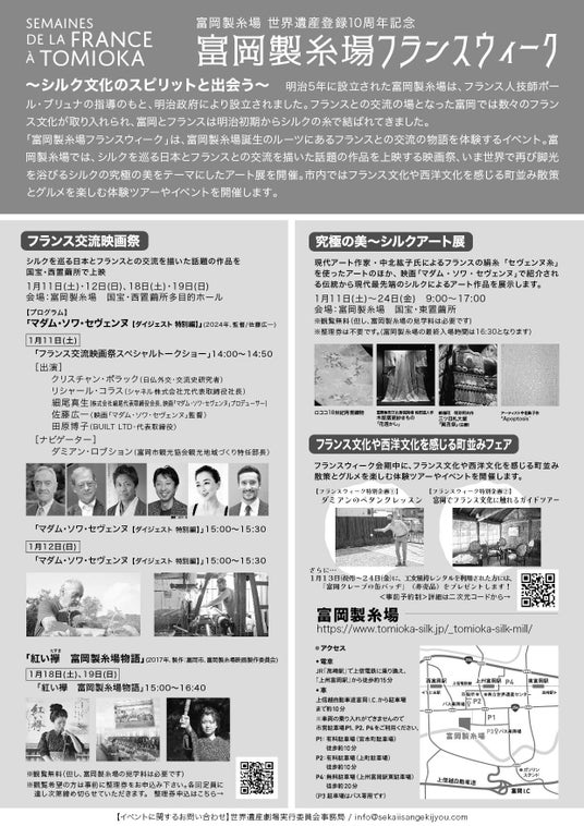 主催:富岡製糸場フランスウィーク実行委員会(富岡市、一般社団法人富岡市観光協会、一般社団法人富岡シルク推進機構、富岡製糸場映画製作委員会、一般社団法人世界遺産劇場実行委員会)