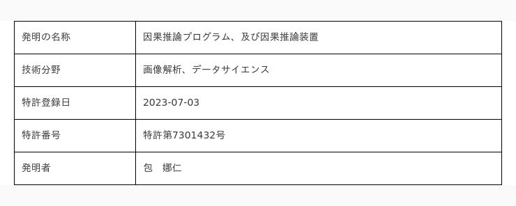 当社は「AI画像解析による肌測定化粧品効果の因果推論プログラム、及び因果推論装置に関する」特許を取得しました。本特許は、カメラで取得した顔の画像から肌の状態を自動で診断する装置に関するものです。従来の肌測定装置はユーザに客観的な肌の評価を提供しますが、どの化粧品が肌の状態を改善するかについてはユーザが判断する必要がありました。AquaAgeの新特許は、ユーザの肌の状態に適した化粧品を推定できる因果推論プログラムを提供します。化粧品の撮影解析によって商品名及び成分を含む商品情報を取得し、登録日からユーザの肌の特徴量の変化量を算出し、因果関係を推論します。これにより、化粧品の登録日と特徴量との因果関係を判断し、ユーザの肌の状態に適した化粧品を推定することが可能となります。