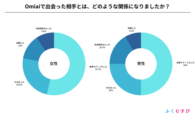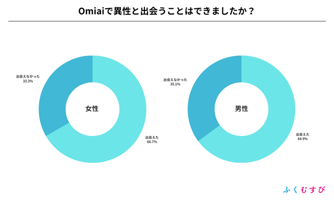 ・Omiaiで異性と出会えた割合は、男性が64.9%、女性が66.7%となりました。