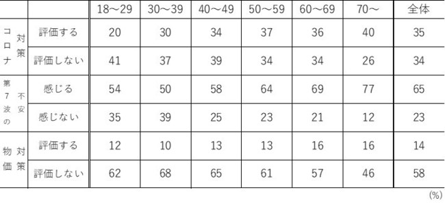 【表2】コロナ対策評価・「第7波」の不安・物価対策評価(年齢別)