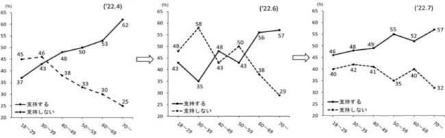 【図1】をご覧ください。年齢別の内閣支持率・不支持率のグラフです。「若低-老高」型の安定構造に支えられていた岸田内閣の支持率は、6月(中図)に、50代で支持と不支持が逆転したのをはじめ、30代では不支持率が12ポイント上昇して不支持と支持のポイント差が拡大するなど、若・中年層における低下傾向がみられました。